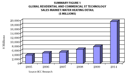 Wellesley, Mass. – According to a new technical market research report, GLOBAL MARKETS FOR RESIDENTIAL AND COMMERCIAL SOLAR THERMAL TECHNOLOGIES (EGY069A) from BCC Research (www.bccresearch.com), the global market for residential and commercial solar-thermal technologies is worth an estimated $8 billion in 2009, but is expected to increase to nearly $20 billion in 2014, for a 5-year compound annual growth rate (CAGR) of 19,8%.