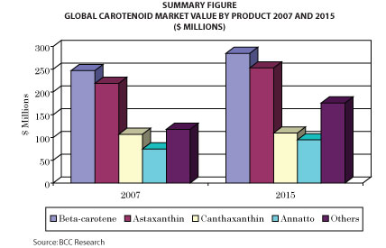 According to a new technical market research report, The Global Market for Carotenoids (FOD025C) from BCC Research, the global market for carotenoids was worth $766 million in 2007. This is expected to increase to over $919 million by 2015, a compound annual growth rate (CAGR) of 2.3%.