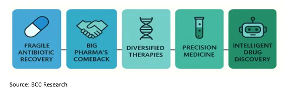 Precision Integration and Emerging Technologies: Pharma R&D is increasingly aligning with precision medicine. The development of companion diagnostics is becoming increasingly standard in pharmaceutical pipelines, enabling the responsible use of antimicrobials. At the same time, AI drug discovery and CRISPR, which is used for gene editing in antibiosis targets and synthetic biology, are completely reshaping upstream research by allowing for the rapid identification of novel compounds and engaging trial participants, making them more likely to succeed.