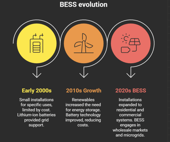 Early 2000s: BESS installations were relatively small in scale and primarily targeted specific uses, such as emergency power for essential facilities. Lithium-ion batteries, the leading technology due to their high energy density, were costly, limiting their broad acceptance. Batteries primarily provided fundamental grid support services, such as frequency regulation.