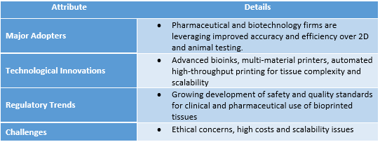 Recent healthcare trends have focused on precision medicine and the elimination of animal testing, both of which are driving the pharmaceutical industry's adoption of 3D bioprinting. Bioprinted models continue to garner growing acceptance and trust among clinicians and regulators, a vital aspect for eventual translation into the clinical setting and large-scale impact.