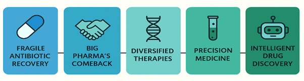 Beyond Antibiotics: A Diversified Approach—New AMR solutions are not limited to the use of traditional antibiotics. In addition to antibiotics, bacteriophages, antimicrobial peptides, microbiome therapies, vaccines, and rapid diagnostics are all being introduced and are the future of a multi-modal therapeutic ecosystem. Such diversification not only deepens the scope of therapy but also has a positive effect on resisting the development of resistance.