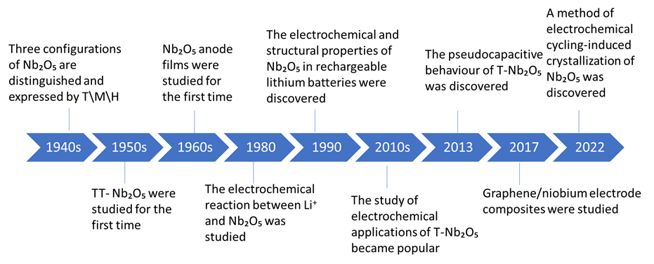 The focus in battery technology research has shifted from simply using crystalline materials based on past studies to justified engineering of niobium oxide compounds, such as niobium-titanium oxide (Nb₂O₅) and niobium-tungsten oxide (NWO). The electrochemical performance of these engineered niobium oxide compounds exhibits significant rate capabilities and cycle lives, much higher than previously explored materials based on graphite or silicon. The figure below represents the historical research progress of Nb₂O₅.