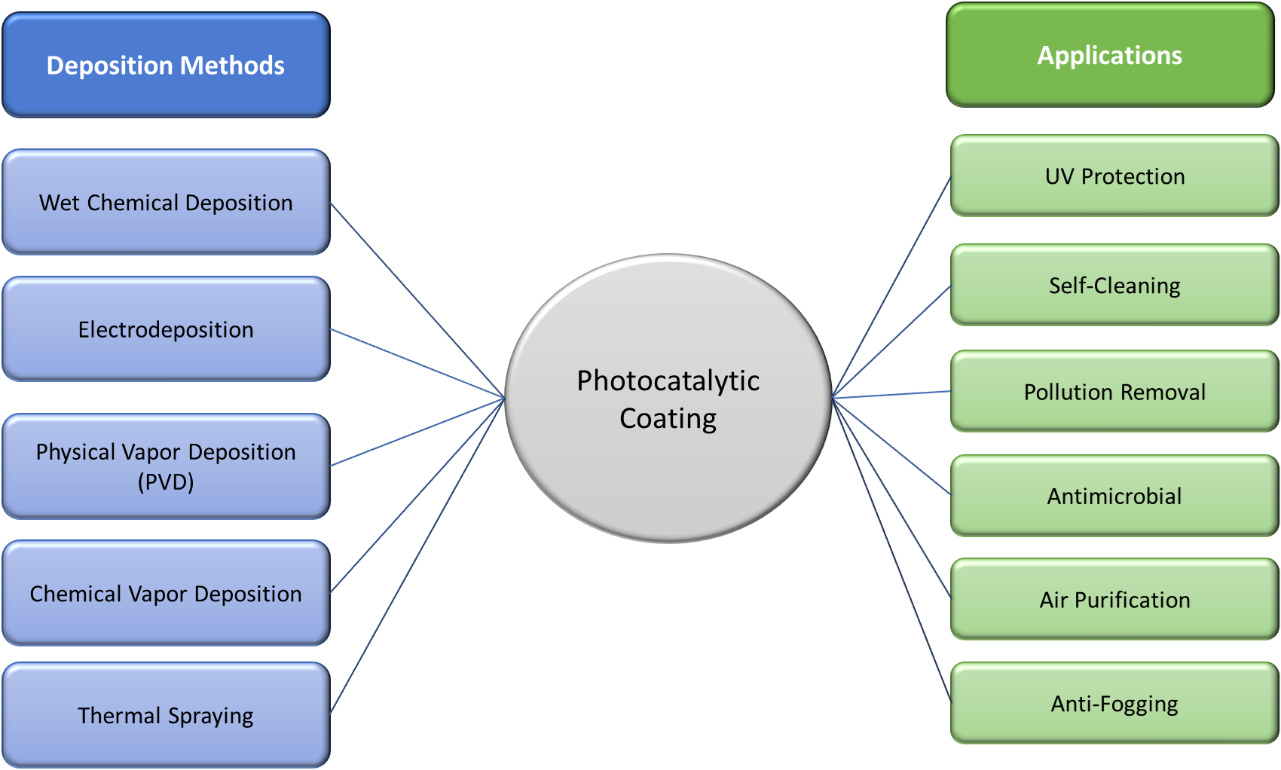 Other than TiO₂, there are different types of photocatalytic coating materials, including zinc oxide (ZnO)-based coatings, metal-doped photocatalyst-based coatings and carbon-based photocatalyst coatings, which offer various functionalities and applications through different deposition techniques. The figure below shows the different types of photocatalytic coating deposition techniques and applications: