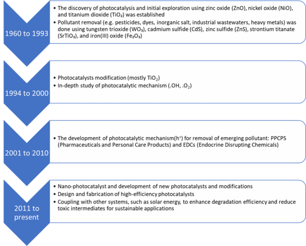 - 2011–Present: The recent timeframe is focused on design and fabrication of photocatalysts with better efficiency for both solar energy and environmental remediation. It involves the development of photocatalysts from advanced nanostructures or hybrid materials, while focusing on performance, stability and scalability.