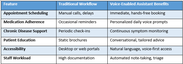 - Integration Across Devices and Platforms: Modern assistants sync with wearables, smart speakers, mobile apps and EHR systems, supporting omnichannel engagement and a unified patient record.