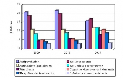 The segment made up of antipsychotics was valued at $22 billion in 2010, and in 2015 should decrease to $16 billion, yielding a CAGR of -6.2%.